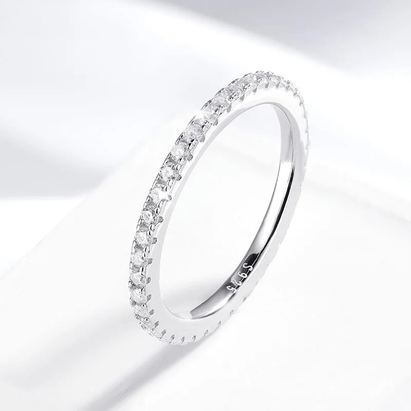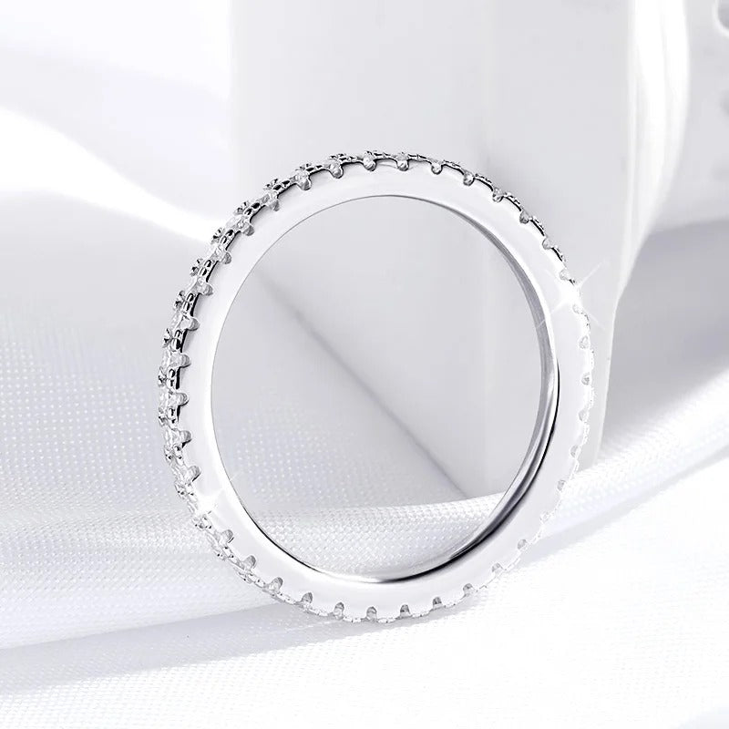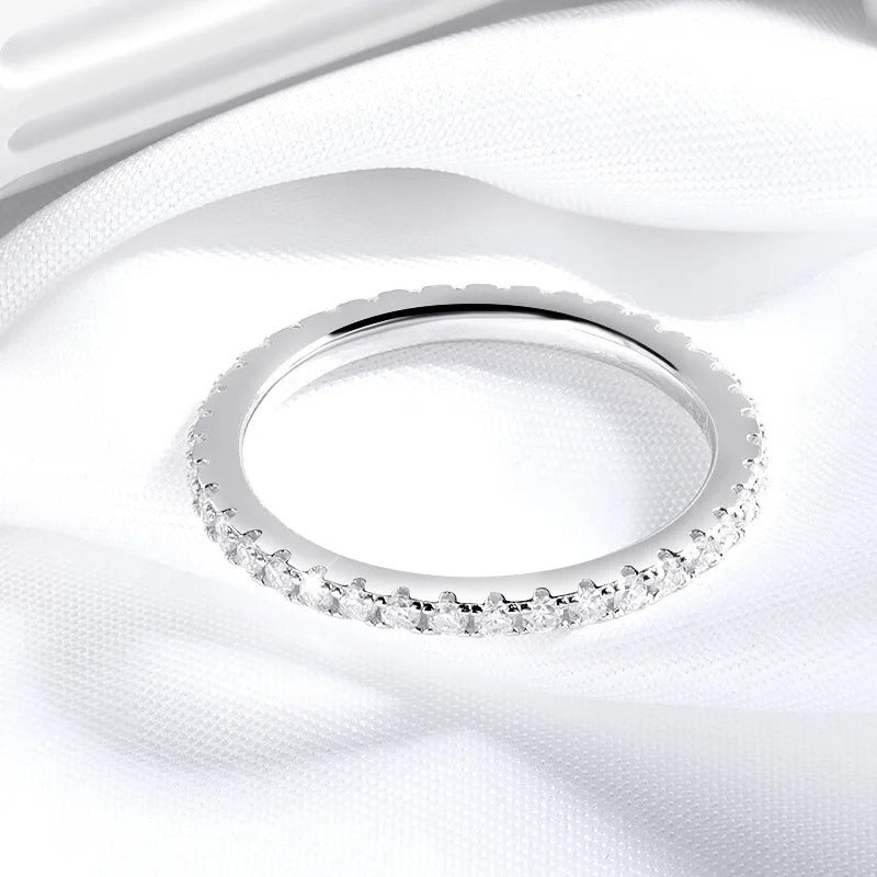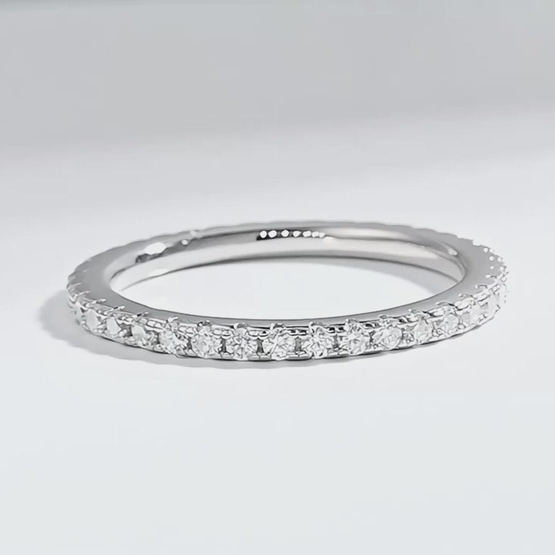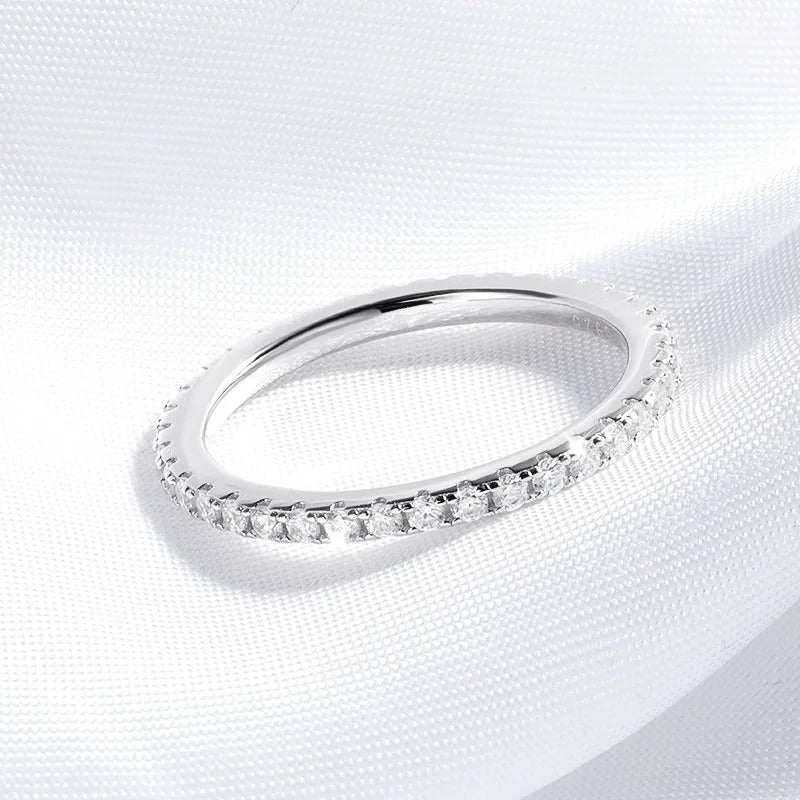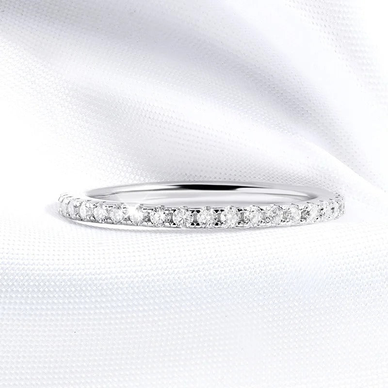 A delicate promise captured in brilliance. This elegant wedding band features a radiant round-cut Moissanite set in luminous 925 sterling silver, designed to celebrate love’s purest moments. Perfect for marking your engagement or embracing your own unique journey.